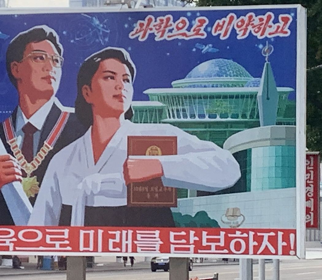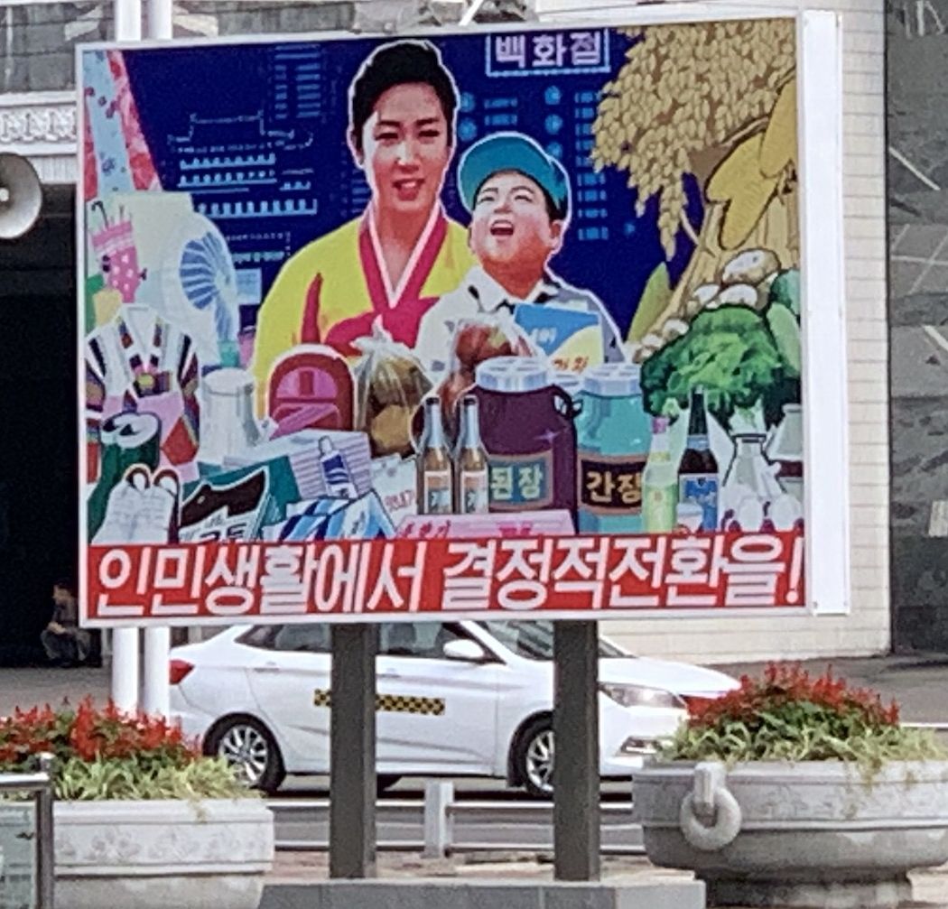 However, this time we saw almost none. The billboards now show much softer images of farmers, scientists, teachers, mothers with children. We even saw one billboard near the airport advertising a car; another revolutionary development. And nowhere could we find any military images on posters to buy, even though we toured the Mansudae Studio where the propaganda artworks are all made. Our guides told us that is because Kim Jong Un is trying to play down the signs of warmongering while there is hope of diplomatic talks with the US.